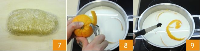Cúbrelo con papel film 7 y colócalo en el frigorífico durante aproximadamente 1 hora. Ahora, ocúpate del relleno a base de risolatte: calienta la leche en una cacerola de borde alto a fuego medio. Lava una naranja y retira la cáscara con un pelador de verduras y agrégala a la leche 8. Con un cuchillo, abre una vaina de vainilla y extrae las semillas deslizando la hoja del cuchillo a lo largo del interior de la vaina. Agrega la mitad de la vaina y las semillas a la leche 9.