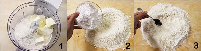 Para preparar la tarta de calabaza, empezad con la masa quebrada: colocad en un procesador de alimentos la harina, la mantequilla fría del frigorífico y una pizca de sal, luego trituradlo todo hasta obtener una masa con consistencia arenosa y harinosa 1. Ahora, trasladad la mezcla obtenida a una superficie de trabajo, formando el clásico "volcán", y añadid el azúcar glas 2, el extracto de vainilla (la punta de una cucharita será suficiente) 3