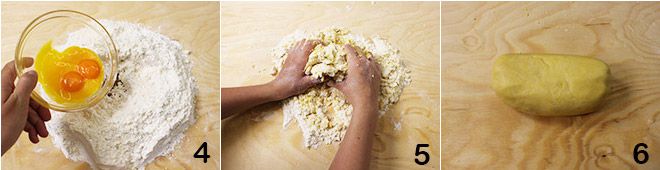 y las yemas 4. Amasad con las manos durante unos minutos 5, hasta que obtengáis una masa suave y compacta 6. Formad ahora una bola, envolvedla con papel film y ponedla a reposar en el frigorífico durante al menos media hora (para más detalles sobre cómo preparar la masa quebrada, Pasta quebrada).