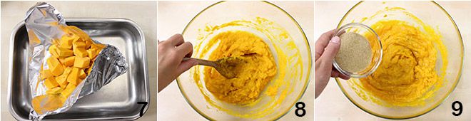 Limpiad la calabaza, retirad las semillas internas y la piel, luego cortadla en trozos y cocinadla en el horno precalentado a 200°, cubierta con una hoja de papel aluminio, durante 45 minutos, o hasta que esté ablandada 7. Pasado el tiempo necesario, trasladad la calabaza a un bol y aplastadla bien con una cuchara o un tenedor 8, añadid el azúcar moreno 9,