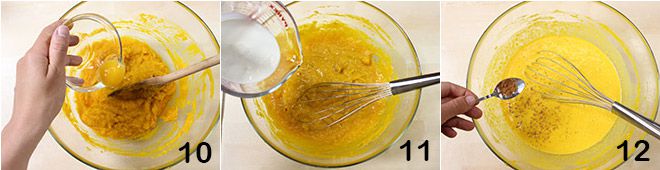 el huevo 10 y luego la nata fresca 11. Finalmente, añadid la canela y la nuez moscada 12,