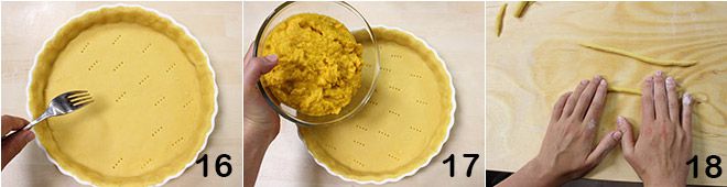 luego extendidla en un molde de 26 cm, engrasado y enharinado. Pinchad el fondo de la masa quebrada con los dientes de un tenedor 16 luego verted la crema de calabaza 17. Con la masa quebrada que sobre, preparad unas tiras 18