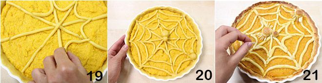 para hacer el diseño de una telaraña 19, luego modelad dos arañas 20: formad cuatro bolitas, dos más grandes para el cuerpo y dos más pequeñas para la cabeza, y colocadlas sobre la telaraña. Hornead la tarta en el horno caliente, precalentado, a 200° durante los primeros 20 minutos y luego a 180° durante otros 30 minutos; si la tarta se dora demasiado, cubrid el molde con papel de aluminio y terminad de cocer. Pasado el tiempo necesario, sacad la tarta del horno, dejadla enfriar completamente y luego decorad las arañitas con láminas de almendra, de modo que forméis las patitas 21.