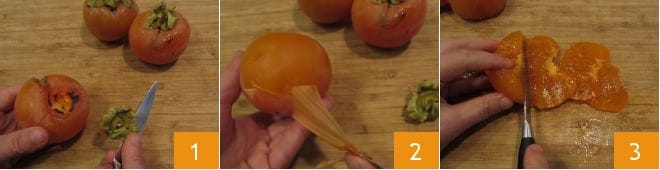 Para preparar el pastel de caqui lava los frutos, corta el pedúnculo 1 y elimina la piel 2, córtalos groseramente 3 y resérvalos.