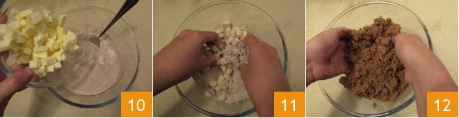 Añade también la mantequilla al bol 10, trabaja la masa rápidamente con las yemas de los dedos 11 para obtener migas 12.