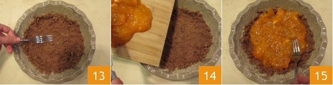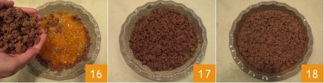Ahora vierte la otra mitad de la masa 16 de manera que cubra completamente el relleno 17. Hornea el dulce en horno estático precalentado a 180° durante 40 minutos. Al terminar la cocción, saca el pastel de caqui del horno, déjalo templar antes de servirlo espolvoreando la superficie con cacao crudo 18.