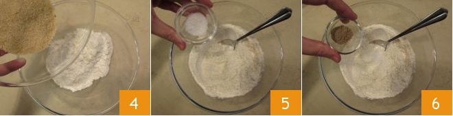 Ahora ocúpate de la masa: vierte la harina tamizada en un bol grande, añade el azúcar de caña 4, la flor de sal 5 y el cardamomo en polvo 6.