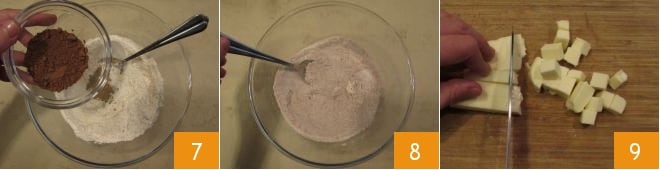 Añade también el cacao crudo 7 y mezcla para combinar los polvos 8. Corta la mantequilla fría en cubos 9.