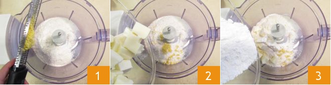Para preparar la tarta de cerezas frescas, primero haz la masa quebrada. En el recipiente de un procesador de alimentos, vierte la harina, la cáscara de limón 1, la mantequilla en cubos 2 y el azúcar en polvo 3.