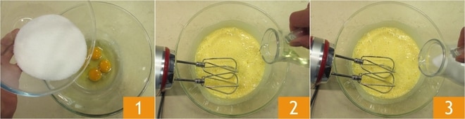 Para realizar la tarta de chocolate, peras y nueces, verted los huevos y el azúcar en un bol grande 1 y comenzad a batir con las varillas eléctricas a máxima velocidad hasta obtener una mezcla esponjosa y espumosa. Agregad el aceite de semillas 2 y la leche 3.