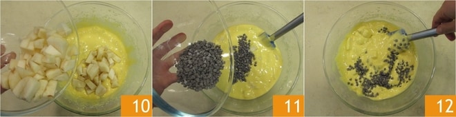 Agregad las peras peladas a la masa 10 y mezclad con una espátula, luego añadid también las gotas de chocolate 11 y mezclad bien todo 12.