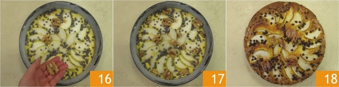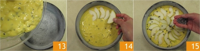 Verted la masa obtenida en un molde de 22 cm de diámetro, enmantecado y enharinado 13. Nivelad la superficie y colocad en forma de espiral las rodajas de pera con la piel 14, luego esparcid las gotas de chocolate 15.