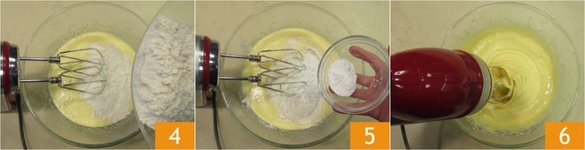 Añadid también la harina 4 y la levadura 5, previamente tamizadas. Trabajad con las varillas a velocidad alta para incorporar los ingredientes 6.