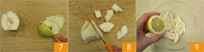 En este punto, pelad una de las peras y dejad la otra con la piel: dividid ambas a la mitad y eliminad el corazón, luego cortad la que tiene la piel en rodajas 7 y la que no tiene piel en trozos 8. En total necesitaréis unos 400 g de peras. Rociad con el jugo de limón para evitar que se oscurezcan 9.