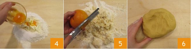 Finalmente, añade las yemas 4 y comienza a amasar a mano rápidamente recogiendo todos los ingredientes, aromatiza con la ralladura de naranja 5, continúa amasando a mano rápidamente para no calentar demasiado la masa con las manos hasta obtener un bloque homogéneo 6