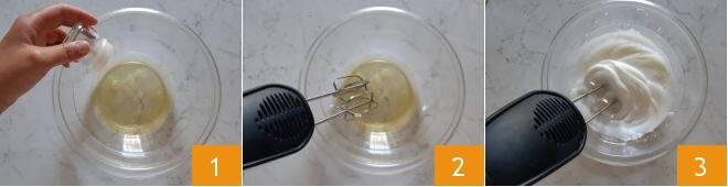 Para preparar la tarta de claras y cacao, como primer paso pon las claras en un bol grande. Añade una pizca de sal 1 y con las varillas eléctricas empieza a montarlas 2, hasta que obtengas claras a punto de nieve firme 3.