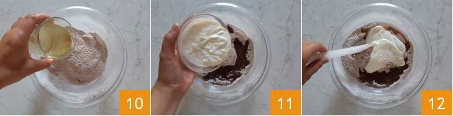 Vierte el aceite 10, el yogur 11 y mezcla con una espátula 12