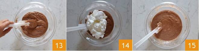 hasta obtener una mezcla lisa y homogénea 13. Incorpora las claras poco a poco 14, mezclando de abajo hacia arriba. Cuando hayas terminado 15