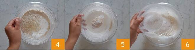 En otro bol tamiza la harina 4 y la levadura 5. Luego añade el azúcar 6