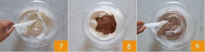 y mezcla los ingredientes secos 7. Luego añade el cacao 8 y mezcla nuevamente 9.