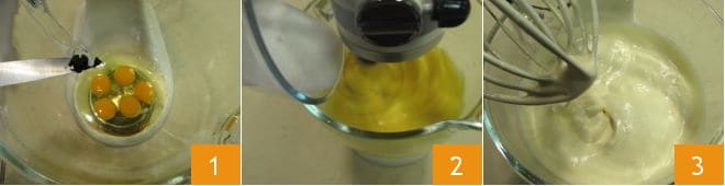 Para preparar la tarta de coco y limón, empezad por realizar el bizcocho. Transfiera los huevos al bol de una batidora, añada las semillas de la vaina de vainilla 1 y una pizca de sal, y empiece a montarlos con el batidor a velocidad media. Mientras tanto, añada el azúcar lentamente 2 y monte los huevos durante unos 15 minutos hasta que estén esponjosos y espumosos.