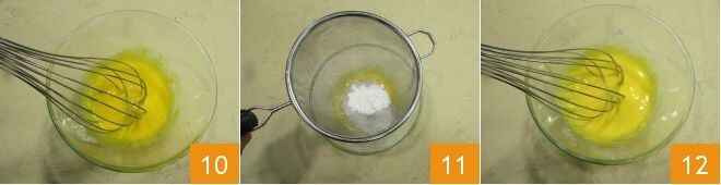 y mezcle rápidamente con un batidor 10. Tamice el almidón directamente dentro del bol 11 y mezcle nuevamente para integrar los ingredientes 12.