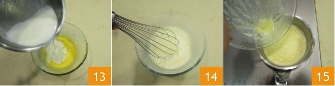 Tan pronto como la leche esté caliente, viértala en la mezcla de yemas 13 y bata rápidamente con el batidor 14. Vuelva a verter todo en el cazo 15