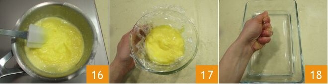 y, mezclando continuamente, cocine la crema hasta que espese 16. Colóquela en un bol pequeño y cubra con film transparente alimentario 17. Mientras tanto, ponga la gelatina en hojas en agua fría y, tan pronto como esté blanda, escúrrala 18