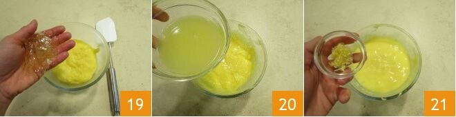 y añádala a la crema 19, que no debe estar hirviendo pero sí caliente. Luego añada el jugo 20 y la ralladura de limón 21.