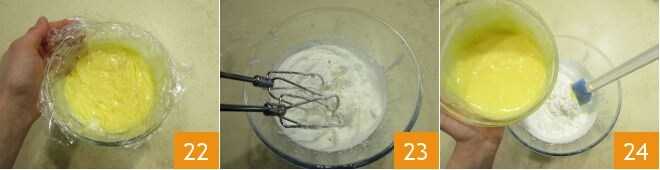 Mezcle bien para incorporar todo, cubra nuevamente con el film 22 y deje enfriar completamente. Tan pronto como la crema esté fría, monte también la nata 23. Luego agregue la crema a la nata en dos veces 24