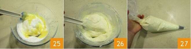 mezclando con una espátula de abajo hacia arriba 25, para no desmontar la mezcla. Una vez que haya obtenido una crema esponjosa 26, transfiérala a una manga pastelera 27 y guárdela en el frigorífico.