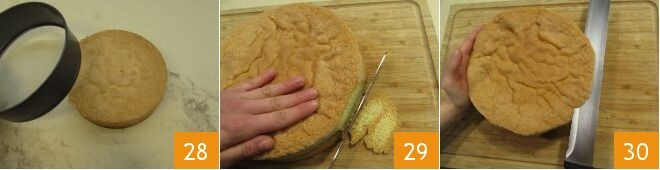 Mientras tanto, el bizcocho también se habrá enfriado; desmóldelo 28 y límpielo de la corteza exterior, tanto alrededor de la circunferencia 29 como en la superficie 30.
