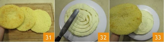 Con un cuchillo de sierra de hoja larga, corte el bizcocho en 3 discos del mismo grosor 31. Coloque el primero en un plato de servir y coloque encima aproximadamente 1/3 de la crema, distribuyéndola de manera uniforme 32. Cubra con la segunda capa de bizcocho 33