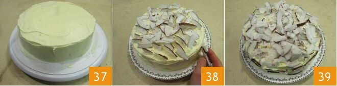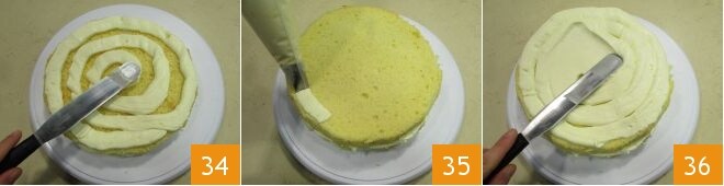 y añada otra capa de crema 34. Coloque el último disco y esparza la crema restante tanto en la superficie como en los bordes 35 y, utilizando una espátula, nivele la crema 36