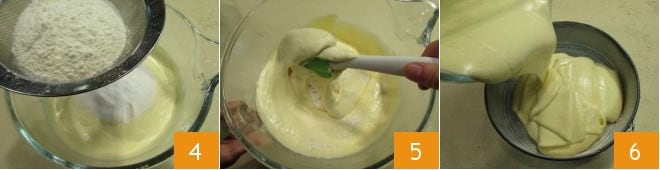 Apague luego la máquina y tamice la harina y la fécula directamente en el bol 4. Luego mezcle suavemente haciendo movimientos rotatorios de abajo hacia arriba 5. Tan pronto como obtenga una mezcla uniforme, transfiérala dentro de un molde de 24 cm previamente engrasado y enharinado 6.