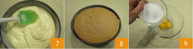 Nivele suavemente la superficie 7 sin golpear el molde sobre la superficie y hornee en horno estático precalentado a 160° en la rejilla más baja durante unos 50 minutos. Evite abrir el horno durante este tiempo y antes de sacar el pastel, verifique la cocción haciendo siempre la prueba del palillo, dado que cada horno cocina de manera diferente. De hecho, al insertar el palillo en el centro de la tarta, este debe salir completamente seco. Una vez cocido, sáquelo del horno y déjelo enfriar 8. Mientras tanto, prepárese para hacer la crema. Lo primero es calentar la leche en un cazo, hasta casi hervir. Coloque las yemas en un bol y añada el azúcar 9