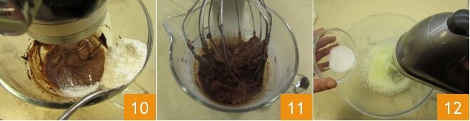 Añádelos poco a poco a la masa 10, manteniendo la batidora a baja velocidad, hasta obtener una mezcla suave y compacta 11. En este punto, empieza a montar las claras a punto de nieve, añadiendo el resto del azúcar (los otros 60 g) solo cuando empiecen a estar claras y espumosas 12.