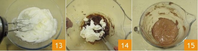 Una vez que las claras estén bien montadas a punto de nieve 13, incorpóralas a la masa de chocolate poco a poco: añade inicialmente un par de cucharadas y mezcla rápidamente para suavizar la masa de chocolate (si es necesario, en esta fase puedes usar una varilla) 14, luego continúa incorporando el resto de las claras esta vez teniendo cuidado de mezclar de abajo hacia arriba, con una espátula, para no desmontarlas. Sigue de esta manera hasta obtener una mezcla suave, sin grumos y espumosa 15.