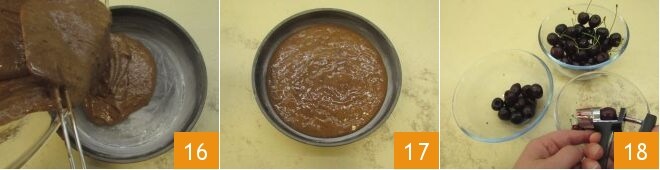 Engrasa y enharina un molde de 22 cm de diámetro y vierte dentro la masa que has preparado (16-17). Hornea la tarta en horno estático precalentado a 160° durante 50 minutos. Mientras tanto, prepara el relleno: deshuesa 200 g de cerezas con la herramienta adecuada 18 o córtalas por la mitad con un cuchillo y extrae el hueso.