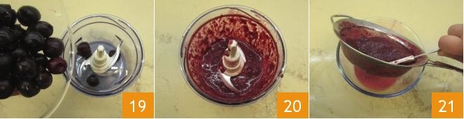 Transfiere las cerezas deshuesadas a una batidora 19, tritúralas hasta obtener un puré homogéneo 20 que vas a tamizar con un colador de malla fina: obtendrás así una mezcla bastante líquida 21.