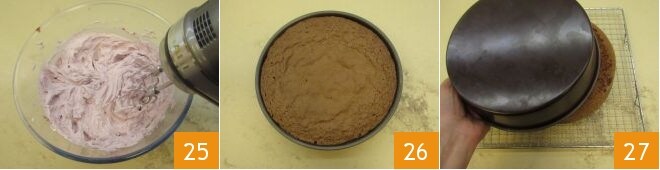 obtendrás una crema suave de color uniforme 25. La parte restante del puré de cerezas te servirá para mojar posteriormente la base de la tarta. Pasados los 50 minutos de cocción de la tarta, haz la prueba del palillo para verificar que esté cocida, luego sácala del horno 26 y déjala enfriar a temperatura ambiente, luego desmóldala con cuidado; el enfriamiento llevará unas 2 horas. Si quieres acelerar el tiempo, una vez sacada del horno, déjala reposar en el molde durante al menos 30 minutos. Luego, desmolda cuidadosamente la tarta en una rejilla 27 para que se enfríe más rápidamente.