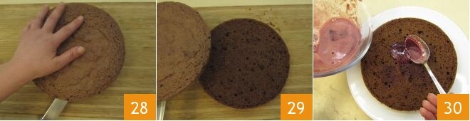Una vez fría, transfiérela a una tabla de cortar y divídela por la mitad (28-29). Coloca el disco de base en un plato para servir, mójalo con el puré de cerezas que te sobró 30,
