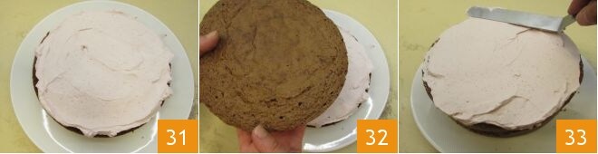 rellena con 1/3 de la crema 31, luego cubre con el otro disco 32 y decora con casi toda la crema restante, útil para cubrir bien la superficie, nivelando con una espátula 33,