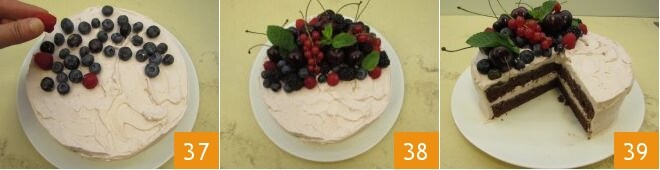 Termina decorando la mitad de la superficie de la tarta con los frutos del bosque mezclados, las cerezas y las hojas de menta (37-38). ¡La tarta de cumpleaños de verano está lista para ser disfrutada 39!