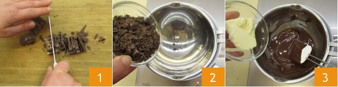 Para preparar la tarta de cumpleaños de verano, comienza por la base. Pica el chocolate negro bastante groseramente con un cuchillo 1 y colócalo dentro de un bol colocado en un cazo con agua para cocinar al baño María 2, asegurándote de que el fondo del bol no toque el agua. Tan pronto como el chocolate se haya derretido completamente, añade la mantequilla 3.