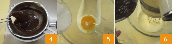 Mezcla con una espátula hasta que la mantequilla esté bien absorbida 4. Una vez completamente derretido, deja templar (no debe enfriarse demasiado); remueve de vez en cuando y asegúrate de que no se formen grumos. Mientras tanto, separa las claras de las yemas: para esta receta necesitarás 145 g de claras y 72 g de yemas (es decir, de unas 4 huevos medianos). Toma las yemas y ponlas en una batidora con varillas y añade 60 g de azúcar granulada (la mitad de la cantidad total) 5, luego monta todo hasta obtener una mezcla clara y espumosa. En este punto, vierte la mezcla de chocolate ya tibia en el bol del batidor 6.