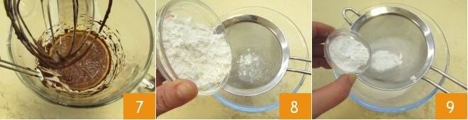 monta hasta obtener una masa homogénea 7. Aparte, en un bol tamiza la harina 8, la maicena 9 y la levadura.
