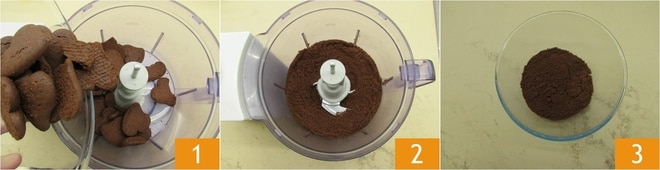 Para preparar la tarta de galleta sin cocción, lo primero es preparar la base. Vierte las galletas de cacao en un procesador 1 y tritúralas hasta obtener un polvo 2. Transfiérelo a un bol 3 y reserva.