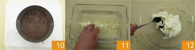 Cuando hayas cubierto bien la base 10 transfiere al frigorífico. Ahora pon en remojo la gelatina en láminas con agua fría 11. Mientras tanto, en un bol, vierte el queso para untar y el extracto de vainilla 12.