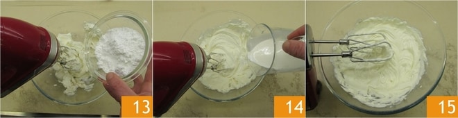 Trabajando con las batidoras eléctricas a baja velocidad, añade también el azúcar glas 13 y 100 g de nata 14. Sigue trabajando hasta obtener una crema lisa y aireada 15.